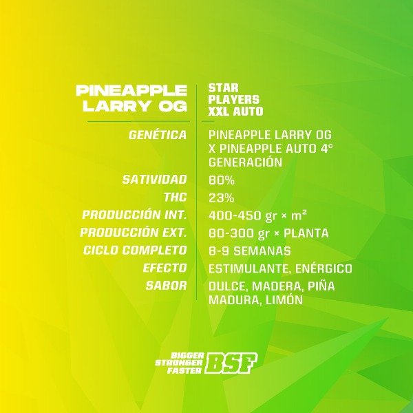 Pineapple Larry OG XXL Auto, es el resultado del cruce de Pineapple Larry OG x Pineapple Auto 4° generación. Esta variedad autofloreciente (automática), mantiene todas las características de su versión fotoperiódica (feminizada) pero con un tiempo acotado de cultivo de entre 70-75 días. Pineapple Larry OG XXL Auto es de predominancia sativa y de THC medio-alto.